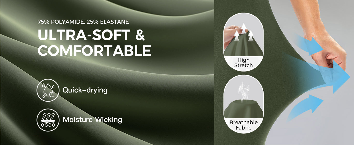 Uses lightweight, stretchy, moisture-wicking fabric—soft on skin, enables free movement, and holds shape.